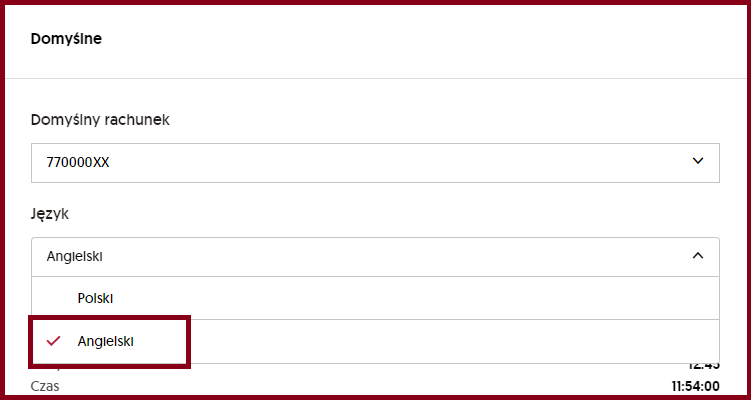 Należy zalogować się do aplikacji i w prawym górnym rogu kliknij numer rachunku/czas sesji>> Personalizacja>> Domyślne - Język>> Angielski>> Zapisz.