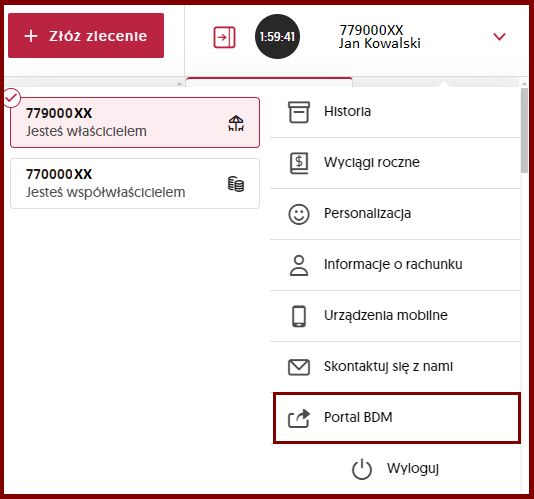 - Kliknij numer rachunku/czas sesji >> następnie Portal BDM